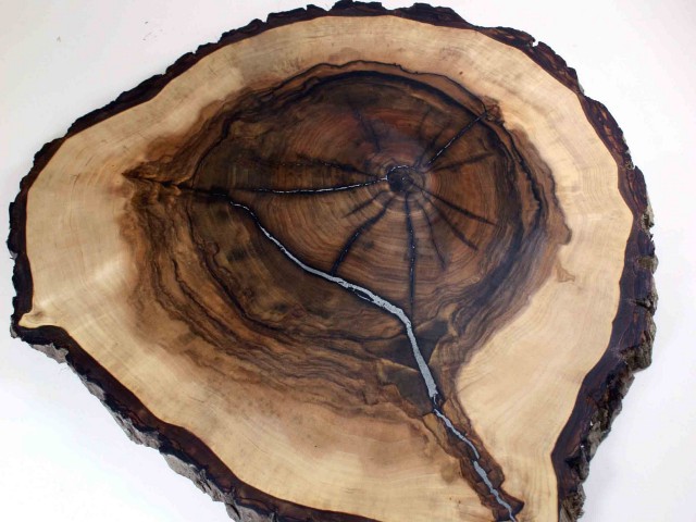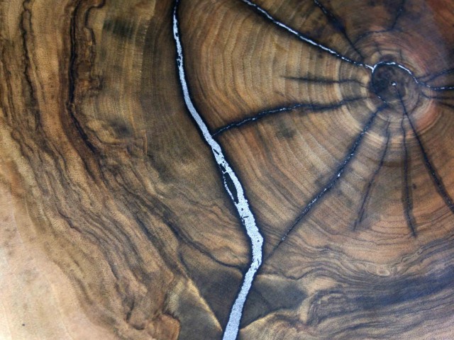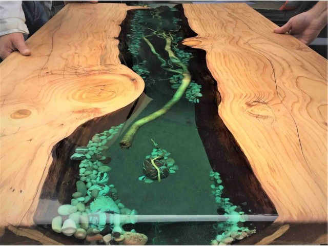 If you prefer the wood parts of your table to have a natural finish, contrasting against the glossy high-shine resin parts then you will need to sand or machine the whole surface of the table and then polish the resin up to a full gloss.