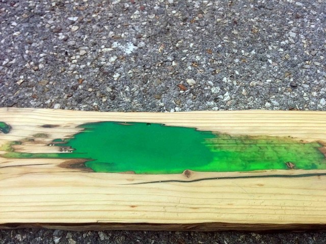 If you will be using a layer of AQUARES to finish the surface of your resin composite then very little preparation is needed. You don’t even need the surface to be particularly flat or smooth, although having a relatively flat surface (without too many high spots) will reduce the amount of resin needed to create a flat surface. If you do have any high spots, remove them first with a sanding block or sanding machine. Simply use a coarse abrasive paper over the whole surface, including the resin and the wood. Don’t worry about the resin looking very scuffed, this will disappear completely once the Aquares is poured over. You should aim for a coating thickness of about 2mm for the Aquares surface.